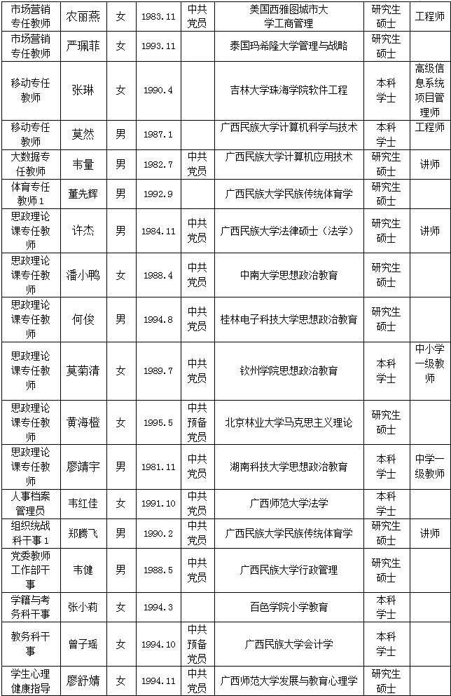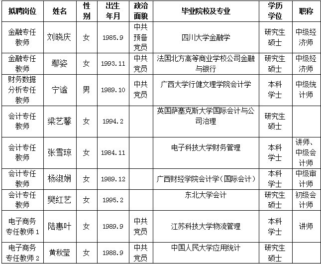 根據《關于印發<廣西壯族自治區事業單位公開招聘人員實施辦法>的通知》(桂人社發[2011]155號)及《廣西金融職業技術學院2021年第一批公開招聘非實名人員控制數工作人員公告》的有關規定,通過報名、資格審查、考試、考核、體檢等程序,經研究決定,擬聘劉曉慶等42位同志為我院工作人員。現將擬聘用人員名單予以公示,公示時間為2021年11月30日-2021年12月8日,如有異議,請于12月8日下午5:00前以書面形式并署真實姓名反饋到學院紀委或組織人事處。聯系地址:廣西南寧市大學西路168號,郵政編碼:530007,聯系電話:0771—3481676,0771—3481779。