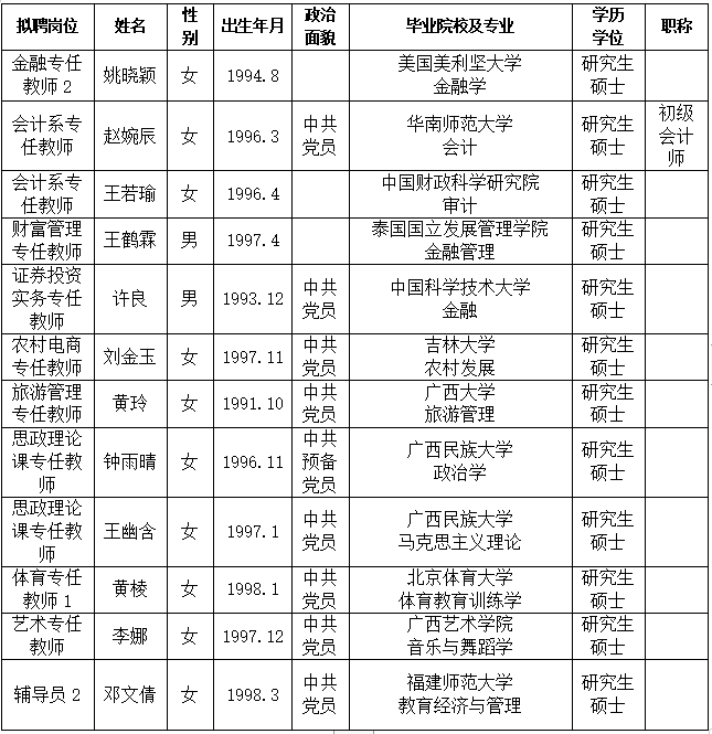 根據(jù)《關于印發(fā)<廣西壯族自治區(qū)事業(yè)單位公開招聘人員實施辦法>的通知》(桂人社發(fā)[2011]155號)及《廣西金融職業(yè)技術學院2023年第一批公開招聘非實名人員控制數(shù)工作人員公告》的有關規(guī)定,通過報名、資格審查、考試、考核、體檢等程序,經(jīng)研究決定,擬聘姚曉穎等12位同志為我院工作人員。現(xiàn)將擬聘用人員名單予以公示,公示時間為2023年5月23日-2023年5月29日,如有異議,請于5月29日下午5:00前以書面形式并署真實姓名反饋到學院紀委或組織人事處。聯(lián)系地址:廣西南寧市大學西路168號,郵政編碼:530007,聯(lián)系電話:0771—3481338,0771—3481779。