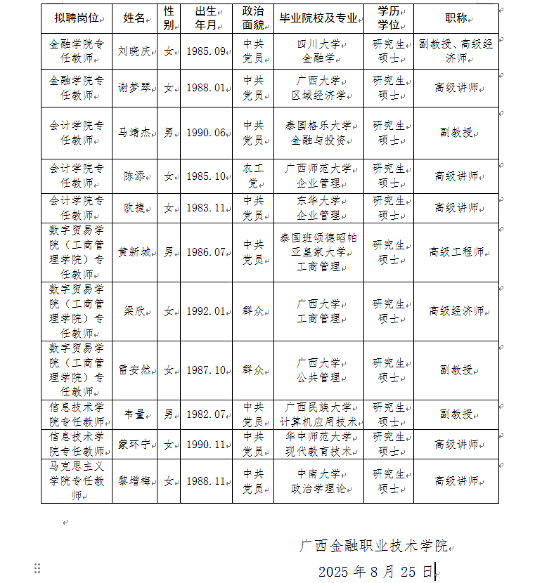 根據《關于印發〈廣西壯族自治區事業單位公開招聘人員實施辦法〉的通知》(桂人社發〔2011〕155號)及《廣西金融職業技術學院2025年公開招聘高級職稱人才公告》的有關規定,通過報名、資格審查、考試、考核、體檢等程序,經研究決定,擬聘劉曉慶等11位同志為我校工作人員?,F將擬聘用人員名單予以公示,公示時間為2025年8月25日-2025年8月31日,如有異議,請于2025年8月31日前以書面形式并署真實姓名反饋到學校紀委或人事處。聯系地址:廣西南寧市大學西路168號,郵政編碼:530007,聯系電話:0771—3481338,0771—3481779。