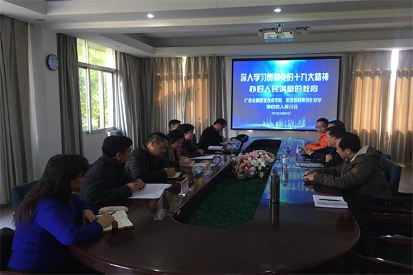 12月21日下午,我院在東校區五樓會議室召開深入學習貫徹十九大精神 辦好人民滿意的教育——廣西金融職業技術學院職業教育集團化辦學協同育人研討會。中聯集團教育科技有限公司董事長楊尚想、祥浩集團副董事長丘樹旺、學院黨委書記沈立君及相關部門主要負責人參加了會議。會議由沈立君書記主持。