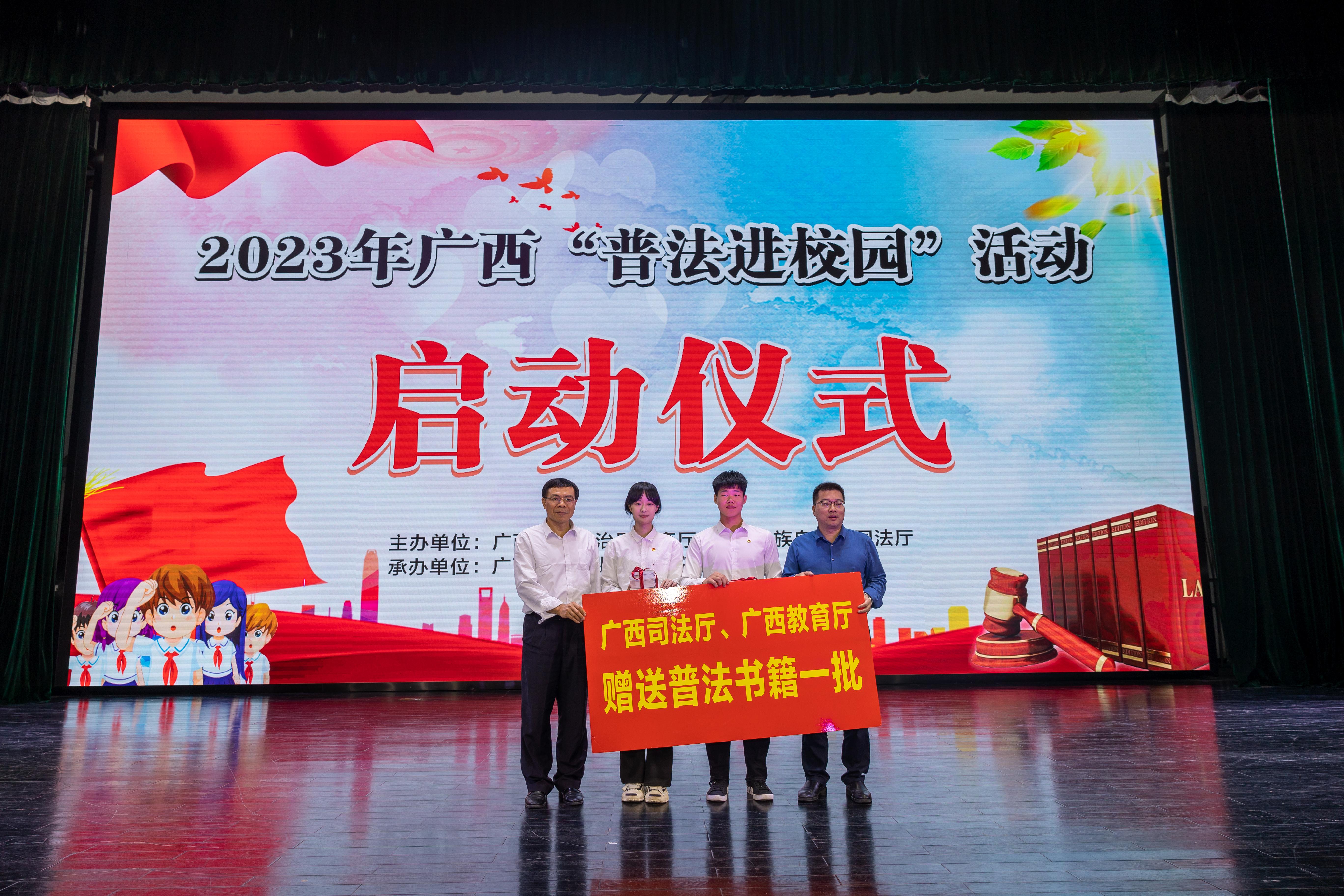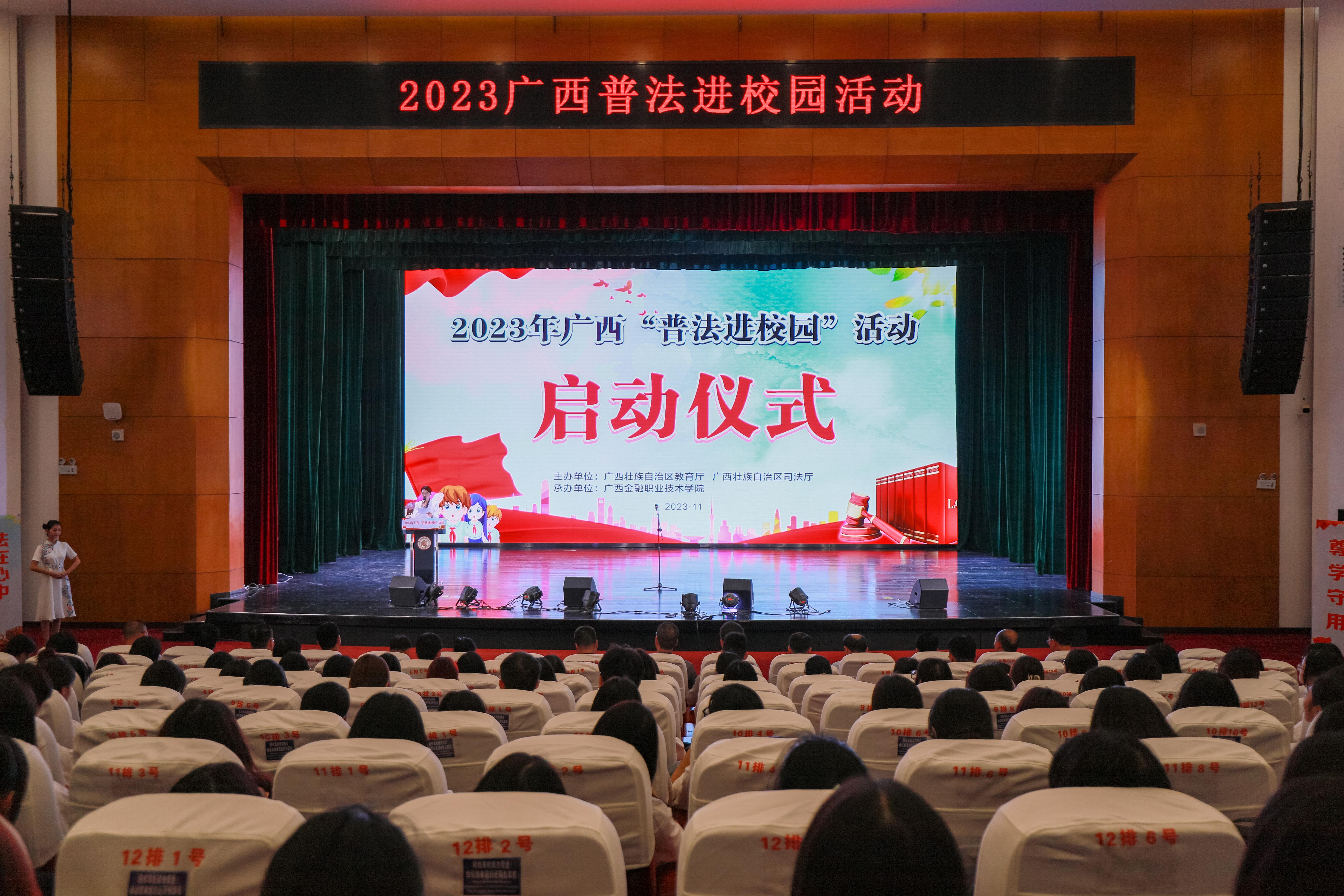 為全面學習貫徹黨的二十大精神,營造尊法、學法、守法、用法的良好法治濃厚氛圍,推動青少年法治教育常態化長效化,11月23日下午,由自治區教育廳、自治區司法廳主辦,廣西廣播電視臺承辦、廣西職業技術學院等10所中高職學校協辦的2023年“普法進校園”主題活動啟動儀式在我校西校區國際會議中心成功舉辦。自治區教育廳政策法規處處長李輝善、自治區司法廳普法與依法治理處處長陸建武、廣西廣播電視臺青少年普法欄目組人員、協辦單位學校代表等出席啟動儀式。