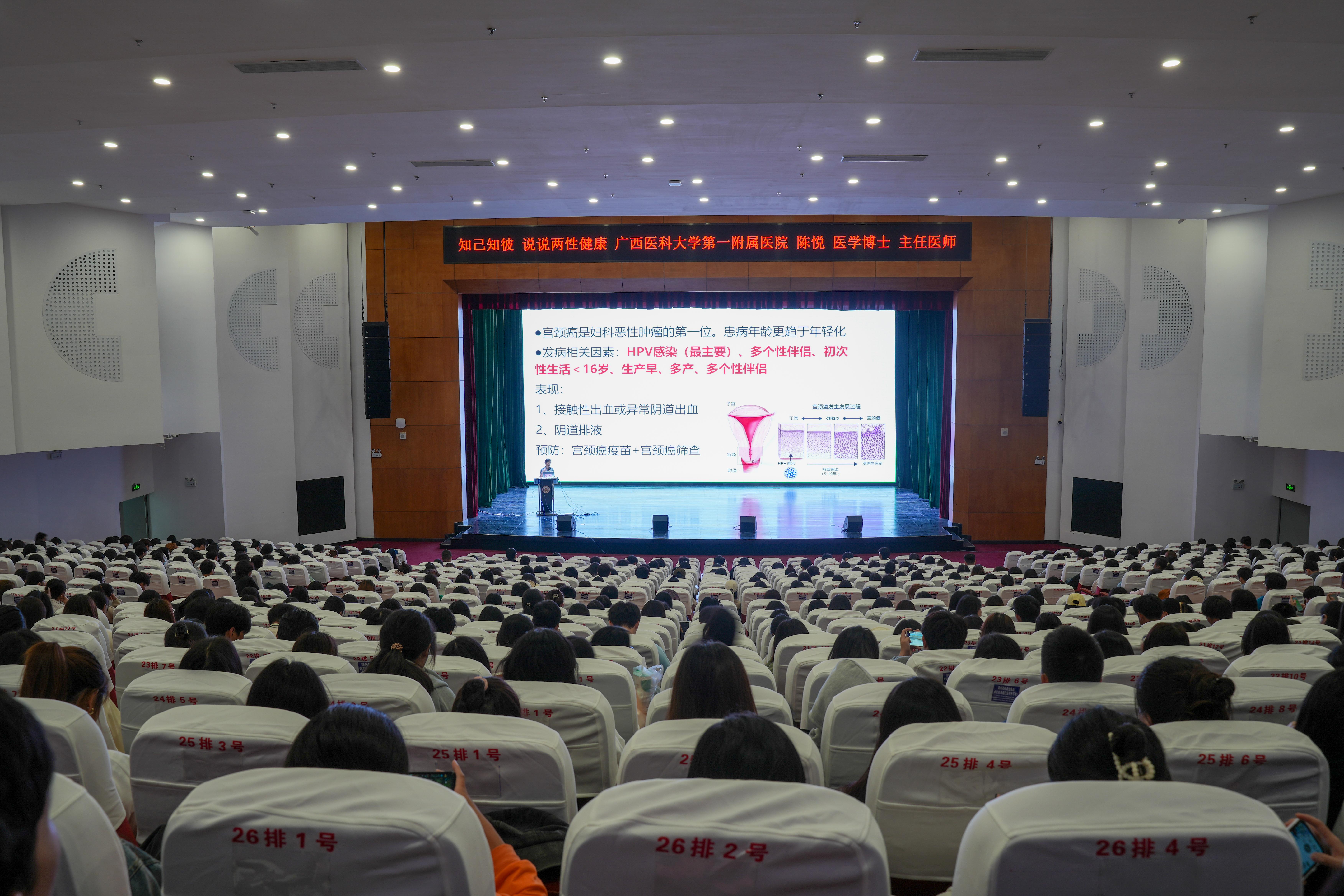 廣西醫科大學第一附屬醫院產科主任醫師陳悅博士以“知己知彼 說說兩性健康”為主題,引用發生在婦產科的案例深入淺出地講授兩性健康知識,從女性生理結構、兩性健康、性安全教育、兩癌預防等方面進行了精彩授課,教育引導女同學要保護好自己、關注自身健康、掌握必要的生育健康知識,具備提高辨別危險行為的能力。