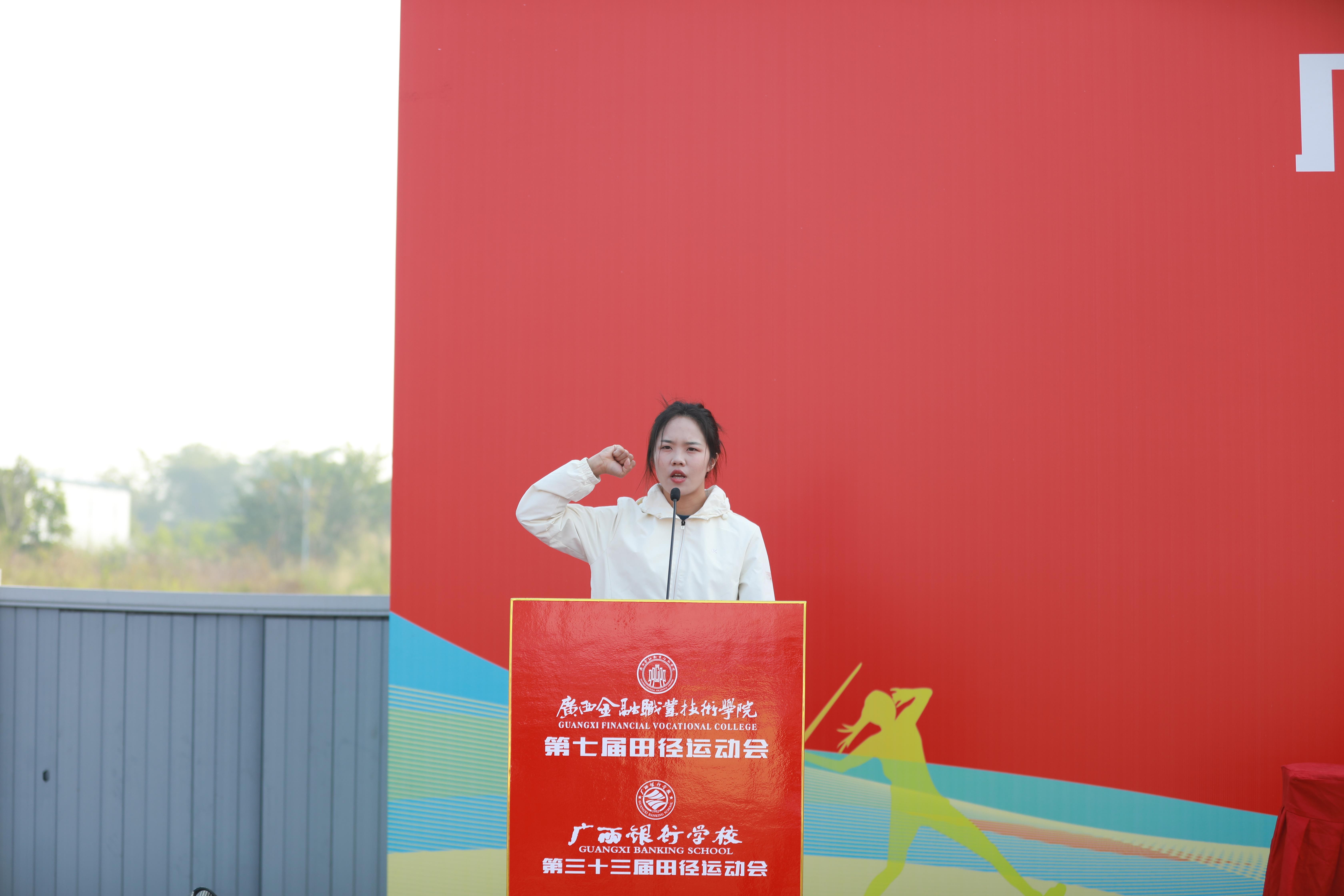 在宣誓環節,運動員代表信息技術學院尤伊文同學和裁判員代表人文教育學院黃棱老師依次宣誓。