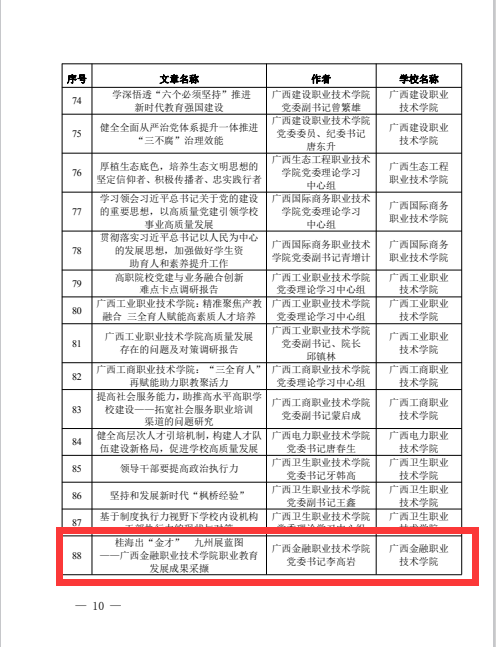 近日,自治區黨委教育工委公布2023年度廣西高校黨委理論學習中心組優秀學習品牌和優秀理論(調研)文章,我校黨委書記李高巖理論文章《桂海出“金才” 九州展藍圖——廣西金融職業技術學院職業教育發展成果采擷》獲評優秀理論(調研)文章。