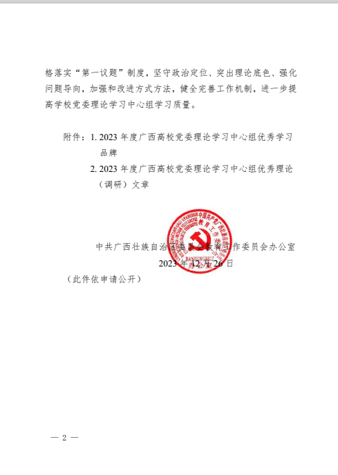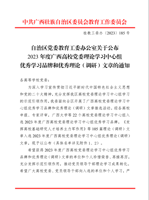 此次評選是自治區教育工委為深入學習宣傳貫徹習近平新時代中國特色社會主義思想和黨的二十大精神,充分發揮我區高校黨委理論學習中心組學習的示范引領作用而面向全區開展了廣西高校黨委理論學習中心組優秀學習品牌和優秀理論(調研)文章推選活動。經各高校申報、專家評審,共有22個高校黨委理論學習中心組入選 2023年度廣西高校黨委理論學習中心組優秀學習品牌,105篇理論(調研)文章入選2023年度廣西高校黨委理論學習中心組優秀理論(調研)文章。