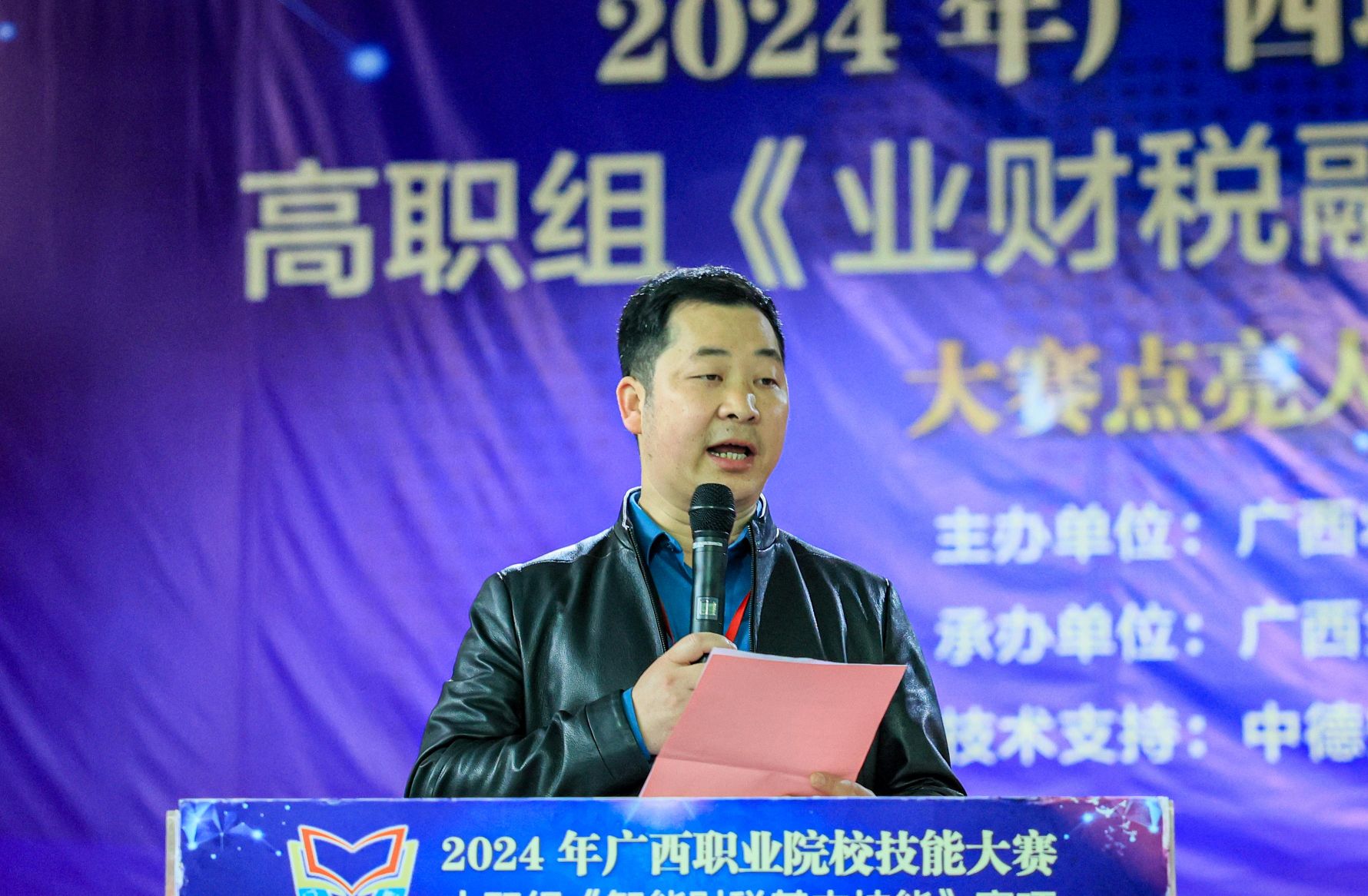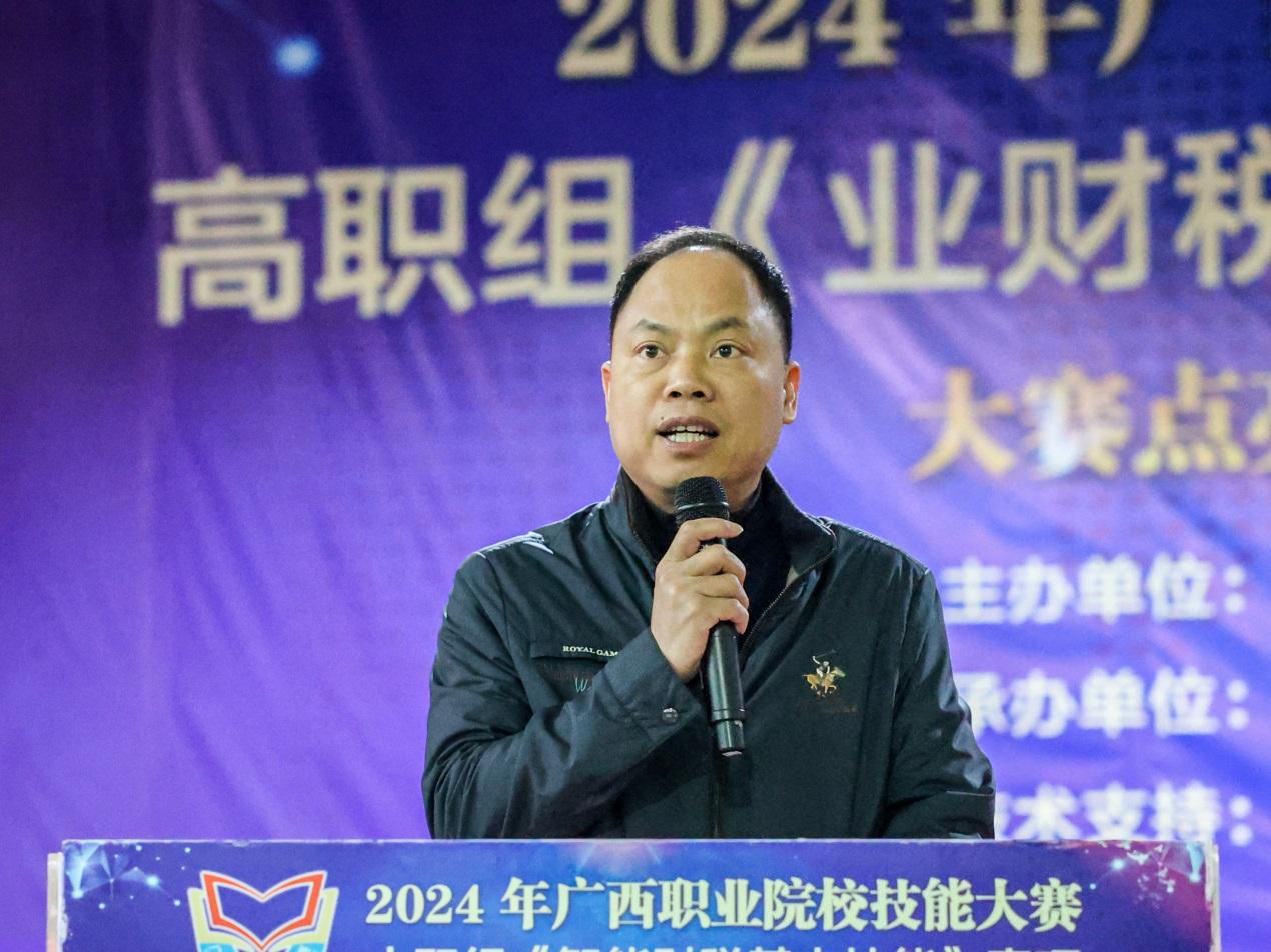 我校副校長謝沛善出席開幕儀式并致辭,他首先代表學校全體師生,向遠道而來的各位裁判、領隊和參賽選手表示歡迎與感謝。他表示,《業財稅融合大數據應用》賽項的舉辦能夠推動廣西職業教育與大數據產業的深度融合,培養具備業財稅融合能力的高素質技能人才,期待通過這次比賽,全方位展示廣西職業院校的教學成果,激發廣大學子對業財稅融合大數據應用領域的興趣和熱情,為未來的職業發展奠定堅實的基礎。