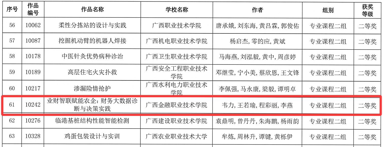 其中,廣西金融職業技術學院派出的兩支參賽團隊憑借出色的課程設計和扎實的教學基本功,雙雙榮獲二等獎;廣西銀行學校派出的兩支團隊也表現突出,均獲得三等獎。